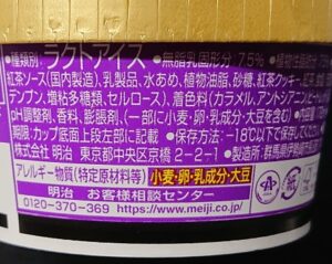 原材料名:紅茶ソース(国内製造)、乳製品、水あめ、植物油脂、砂糖、紅茶クッキー、紅茶、食塩/安定剤(加工デンプン、増粘多糖類、セルロース)、着色料(カラメル、アントシアニン、ビートレッド)、乳化剤、pH調整剤、香料、膨脹剤、(一部に小麦・卵・乳成分・大豆を含む)